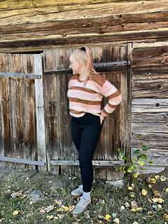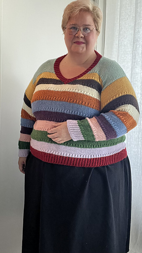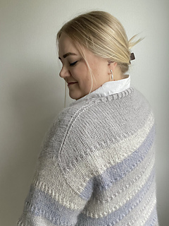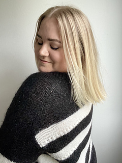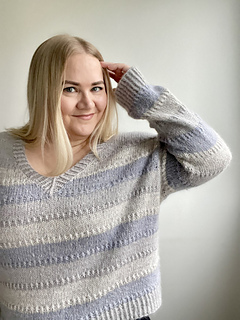 Shadow Lines is a relaxed striped sweater that invites you to explore texture and color. Worked with fingering-weight merino and lace-weight silk mohair held together, it creates a lightweight, drapey fabric that feels luxurious against the skin. Use a single color for a subtle look or dive into your stash for something playful and personal, the possibilities are endless. Choose between a clean V-neckline or a classic round neck or make them both! This sweater is effortless to wear and easy to style. Shadow Lines is written for 10 sizes, and the pattern includes a finished bust range of 84–175 cm / 33–69 inches, with recommended positive ease of 7.5–20 cm / 3–8 inches. This is an ideal sweater for layering or wearing on its own.