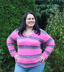 Shadow Lines sweater is worked seamlessly from the top down starting with the back panel. Back and front are worked flat until the underarm and then joined in the round. This sweater has stripes with both texture and color. It has full length sleeves and crisp half twisted ribbing on the neckline, hem and cuffs.