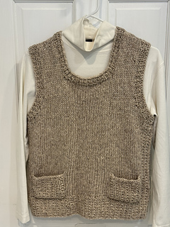 This design is a beginner level vest knit from the bottom up and seamed, with approx 5-10 cm/ 2-4 in of positive ease. The yarn of choice is the softest and plushest natural undyed combination of llama and merino. Optional pocket feature to knit and sew on as an afterthought, just the right size to hold your cell phone.