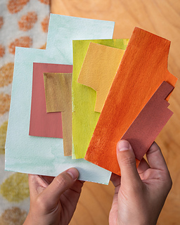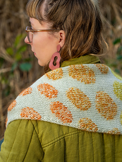 The Shifting Moods Scarf is a small triangular scarf knitted in stockinette stitch using a combination of the intarsia technique and marling to create botanical abstract motifs.