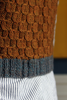 I love how these two colors play off each other. The flecks of rust in my blue Badi Da (left over from my Plymouth Gin Hat) pick up the brown and orange tones of the Russet background yarn beautifully - and the Russet has some blues and greens in there that reach right back into the blue. The two shades are perfect together and the vibe they lend to the vest is that perfect Fall Librarian I was hoping for.