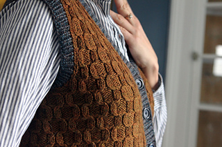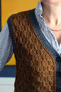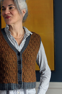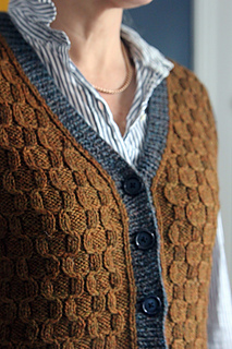 My vision was for a vest with a bookish vibe, and you know I wanted classic, but not something I’d seen before. With that in mind, I found cables that look somewhat like honeycomb, but not quite. The lines are more detailed, crisply folding to and fro as they climb up the body. The resulting fabric is dense and delicate, and the shapes are almost boxy. These cables really catch your eye when knit in a yarn with some depth of color, which visually draws the texture out even more.