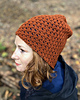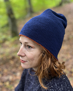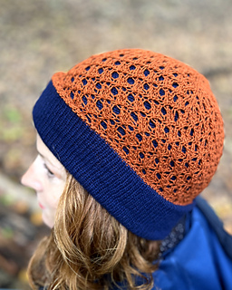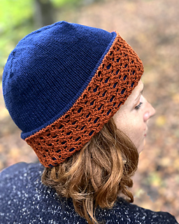 Die Wende-Mütze ist in zwei kontrastierenden Farben gestrickt. Eine Seite weist ein Lochmuster auf, während die andere Seite glatt gestrickt ist.