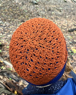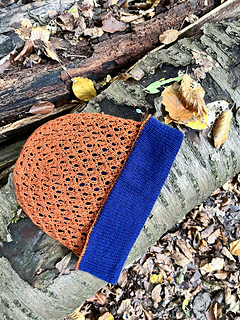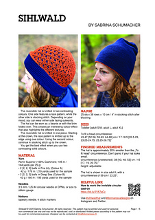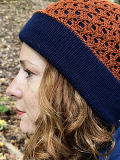 The reversible hat is knitted in one piece. Starting at the crown, the lace pattern is knitted up to the edge using one colour. Using the second colour, continue in stocking stitch up to the crown.