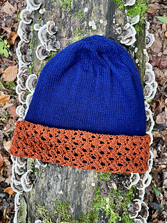 The reversible hat is knitted in two contrasting colours. One side features a lace pattern, while the other side is stocking stitch.