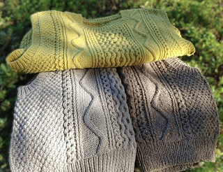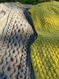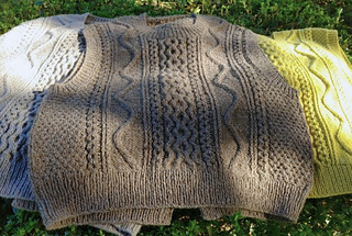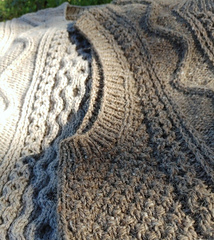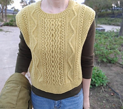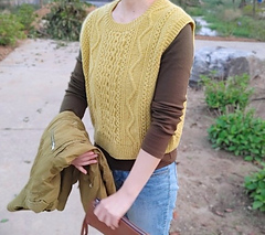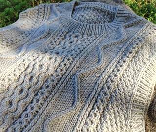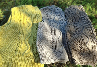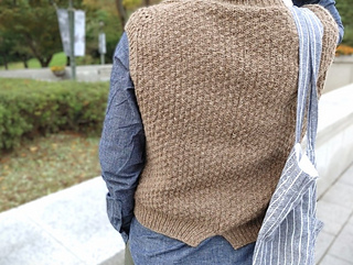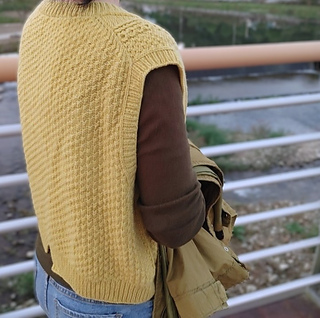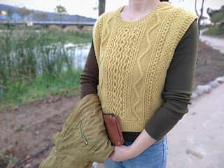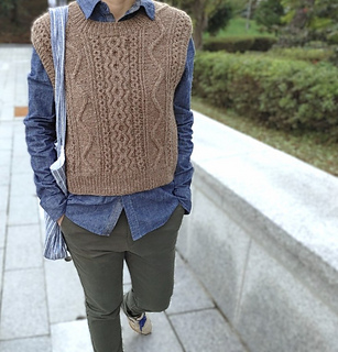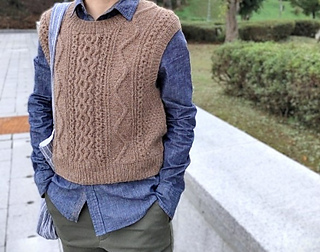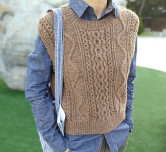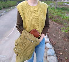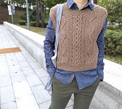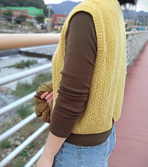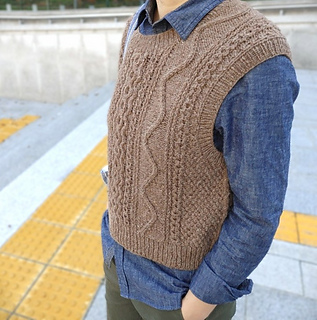 “물수제비 슬립오버”는 탑다운(top-down)으로 뜨는 라운드넥 조끼입니다. 앞에는 교차뜨기를 이용한 여러 가지 꽈배기 무늬와 멍석무늬가 있고, 뒤에는 겉뜨기와 안뜨기로만 이루어진 무늬가 있습니다. 앞판에 들어간 꽈배기의 조합이 마치 강가에서 돌을 던져 튕기는 물수제비 뜨기를 할 때 나타나는 물 표면의 동그라미들 같아 조끼의 이름을 ‘물수제비 슬립오버’라고 지었습니다.