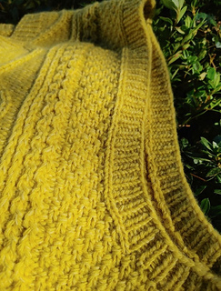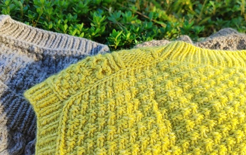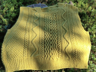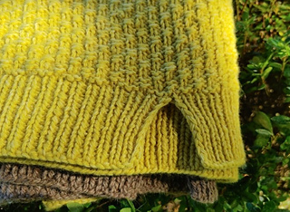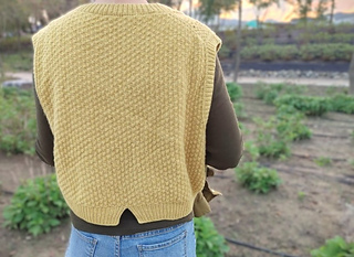 뒤판 코를 잡아서 늘림을 하며 뜨다가 평단을 떠주고, 암홀 늘림을 한 후에 쉼코로 둡니다. 뒤판의 어깨에서 앞판의 왼쪽과 오른쪽 코를 주워 각 각 앞목 늘림을 하여 뜬 후에 합체하여 뒤판과 같은 방식으로 암홀 늘림 부분을 작업해줍니다. 그 다음에 앞판과 뒤판 코를 한 번에 연결하여 원통 뜨기로 몸판을 뜨고 뒷트임이 들어간 고무단으로 마무리해 줍니다. 마지막으로 목둘레와 암홀에서 각 각 코를 주워 1코 고무단을 뜨고 마무리해 줍니다.