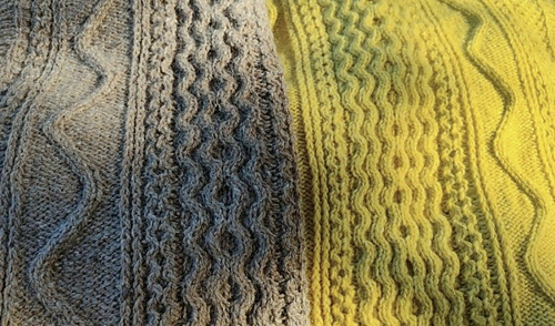 앞판과 뒤판의 무늬가 다르고 무늬에 따른 장력이 서로 다르기 때문에 되도록 세탁 후에는 약간의 블로킹 작업을 이용해 앞, 뒤판의 너비를 맞추어 말리는 것을 권장합니다.