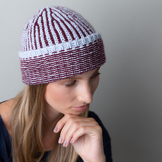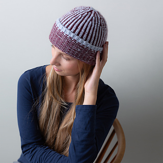 The SLIP RIB HAT is worked in rounds, beginning with a narrow ribbed edge. The main part features a two-color rib pattern,
