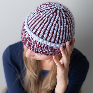 using only one color per round. Decreases are incorporated into the pattern to shape the crown and create a distinctive visual effect. Thanks to the slipped stitches of the two-color rib, a dense and warm fabric is created, making this hat a cozy staple for fall and winter.