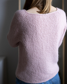 The work begins with the short row shaping on the neckline and raglan increases. When the yoke is completed, sleeve stitches are placed on hold. The body is then worked in the round towards the hem. Sleeve stitches are then placed back on the needles and the sleeves are worked in the round towards the cuffs. The neckline remains unfinished but it’s easy to modify by adding a turtleneck or a simple ribbing if desired.