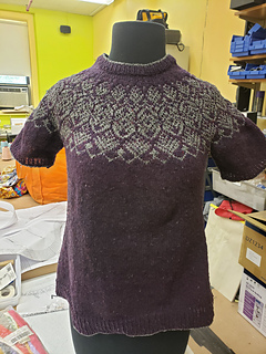 Smoldering Embers is a top down, short-sleeved or long-sleeved pullover with gentle waist shaping that leads to a slight A-line silhouette. Fair isle patterning adorns the yoke only/and the sleeves in the short-sleeve/long-sleeve version, respectively. The contrasting color is used for the neck cast on and sleeve and body bind offs.