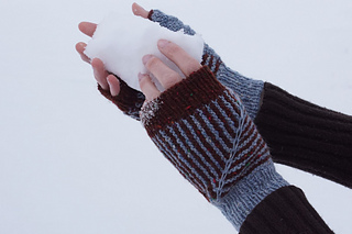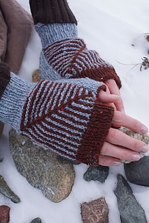 Strange directions and small details make a pair of closely-fitted fingerless mitts with a reversible detail.