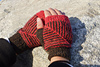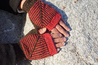 These mitts are knit in modular sections. First, front and back are knit as two conjoined mitered squares, then the thumb is knit sideways with short-row shaping and a small graft. Top and bottom cuffs are added last, finished with a tidy tubular bind-off.