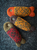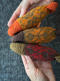 A play on a sister pattern, Star Mittens, both designed at about the same time. This is a mix of knitting (stranded colourwork) and crochet. Makers with experience knitting from a charted colourwork pattern and crocheting in sprial rounds will find this a quick and whimsical project to make. Grab some treasured scrap amounts of yarn, vintage (or orphaned) buttons and you’ll have a fish done in no time.
