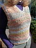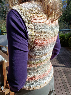 A hip bone length vest with a V neck and no ease with shaping from waist to bust, using a garter stitch with scattered nupps pattern, in a self striping silk/cotton/viscose/mohair/wool/polyamide yarn.