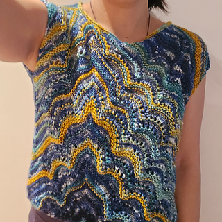 Just 2 skeins result in this lovely tunic that is an assymetrical unusual knit that can be sleeveless (shown in Black Magic Kit) or with short sleeves (shown in Red Sunset Kit).