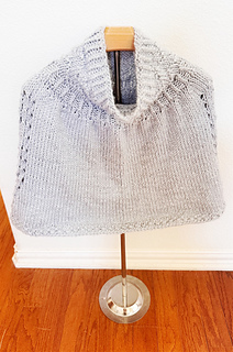 The poncho is knitted in the round from the top down, first in simple knit and purl stitches, creating great textures in the mock turtle neck. Once you are past that part, you increase the body down to the beautiful lace design over both arms, which gets even a bit roomier towards the bottom border. The very edge is knitted in a textured seed stitch pattern to round out the look.