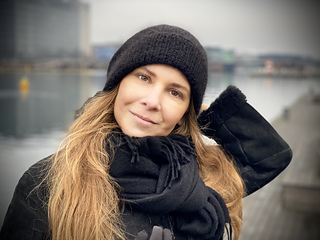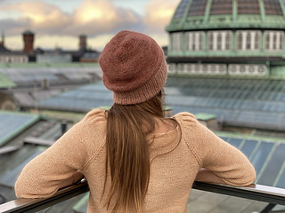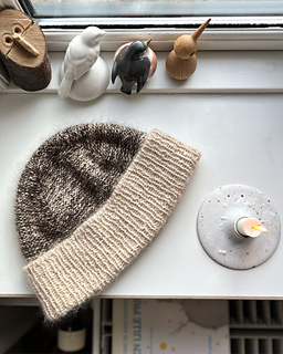 The beanie in the picture is knitted with one strand of Isager Tweed, sand, and silk mohair in colors 6 (ribbed hem) and 34 (stockinette stitch part). One ball of mohair (25 g) is enough to knit a one-colored beanie.