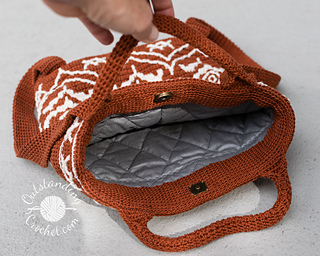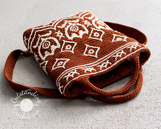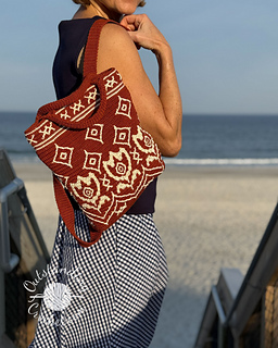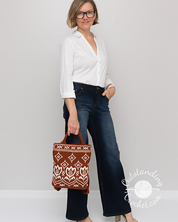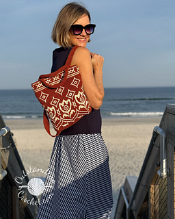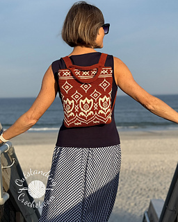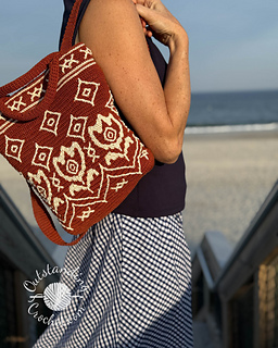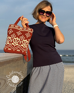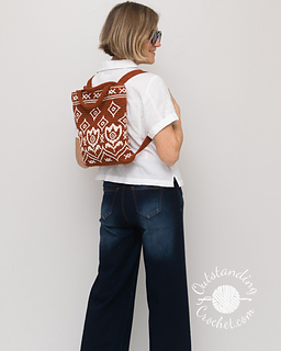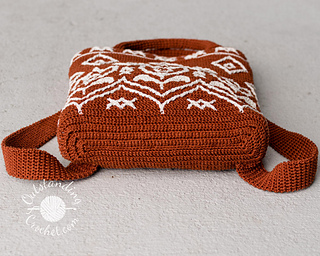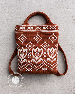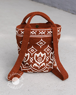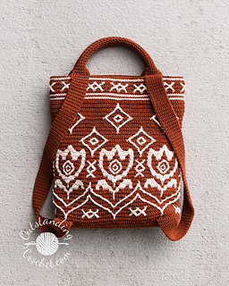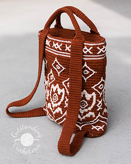 - Yarn1 (background): 265g (with 10% extra) in 388 Rust, including 23g for bottom, 135g for body, 26g for upper edge backing, 14g for the first handle, 66g for backpack straps/second handle)