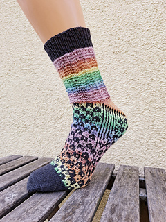 arches, working together to bear the weight. Pattern is worked from an “anatomical toe” up to a gusset heel and textured cuff.