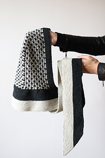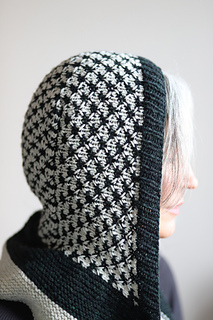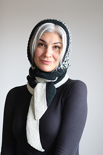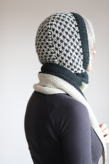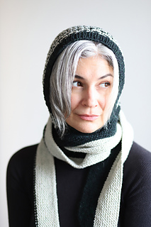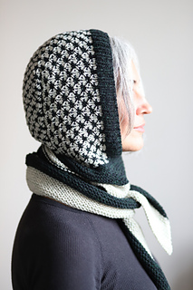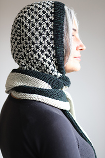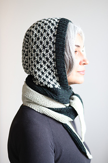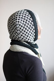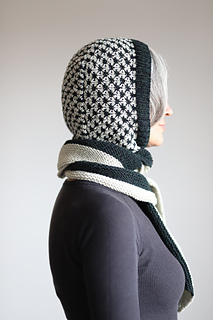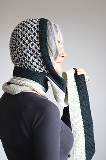 I knit this hood using 2 colors of DK weight yarn. It’s a fast and fun knit combining techniques like modular construction, two color thorn stitch, and it’s finished off with a lengthwise garter stitch scarf. There are also notes for customizing the perfect fit along the way. This is a stylish and functional accessory that would look great on every body!