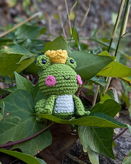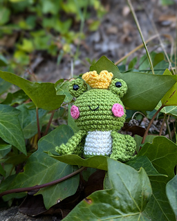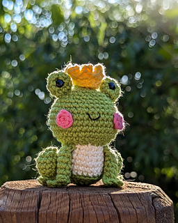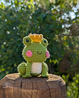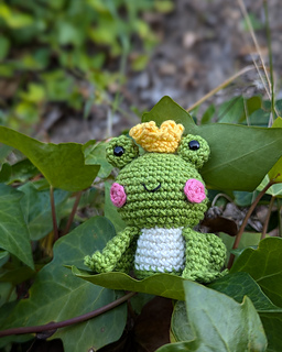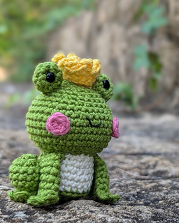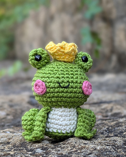 This is a crochet amigurumi PDF pattern to make Tilo the Frog, a tiny 8 cm crowned frog with a cute off-white belly, pink cheeks and top-mounted frog eyes. The design includes detailed legs with little toes and a picot crown.