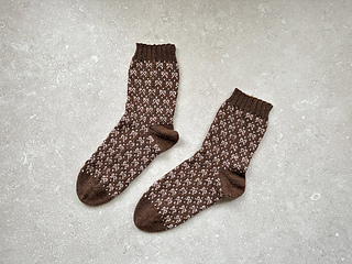 • 실 : 랑 Jawoll (75% 버진 울, 25% 나일론. 핑거링 굵기. 210m/50g.) 바탕색실 – 0095(러스틱 브라운) 1 (1¼)볼, 배색실1 – 0001(화이트) 약 5g, 배색실2 – 0209(소프트로즈) 약 15g.