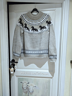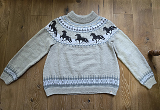 Kurz darauf entstand für meine Tochter ein weiterer Pullover: mit Kapuze zum Zuziehen, einer gemütlichen Kängurutasche und einem Muster aus lauter Islandpferden.