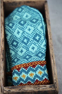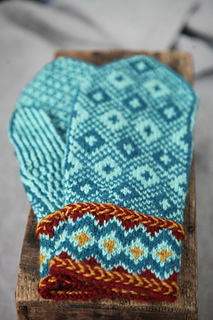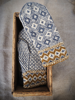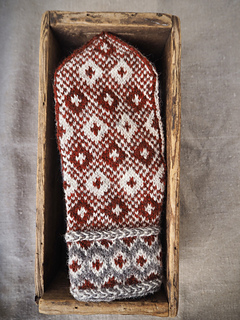 A traditional Scandinavian mitten, knitted in three colours and with sophisticated details like a thumb gusset and Latvian braid. Published in my book Stickning en värmande kärlekshistoria.