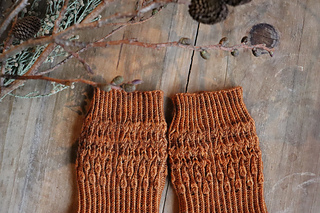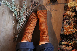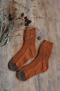 “Twigs and Drops” socks are worked top-down with heel flap. I really enjoy watching small droplets of dew spill from twigs during my autumn walks, sparkling as they reflect the light of dawn or dusk. I designed a pattern around the leg resembling twigs and droplets, pulling loops from the knitted fabric.