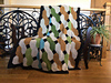 This blanket is worked all in one piece from the bottom-left corner to the top-right corner. New shapes are started by picking up and knitting stitches on previous shapes. The shapes themselves are knitted in garter stitch with increases, decreases and some short rows. A little bit of 3-needle bind off is used in some of the shapes.