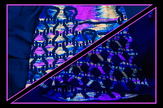 Er wird aus zwei Garnen in der Fair Isle Technik in Runden gestrickt – fast ausschließlich rechts, nur für die kurzen Bündchen sind einige linke Maschen nötig. Verschiedene – einfache – Charts bilden zusammengesetzt das große Motiv mit zwei Fallmaschen.
