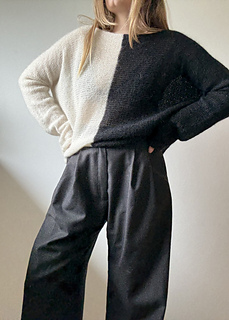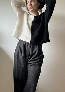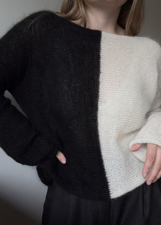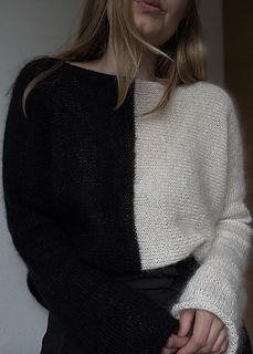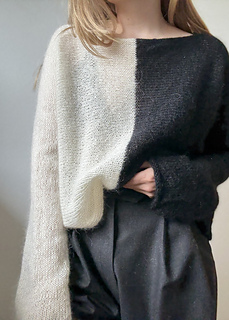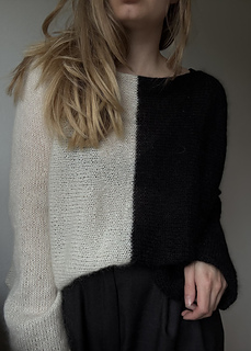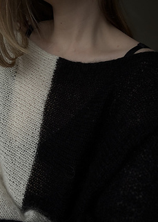 The Ulalume is a light and airy blouse made from soft alpaca, silk and mohair. It is worked from sleeve to sleeve and has an elegant boatneck opening. Each side of the blouse is made in two different colors. Ulalume takes its name from one of Edgar Allan Poe’s fictional characters ‘Ulalume’. The black and white colours are an interpreting the symbolism of the dark and often dramatic poetry by Poe.
