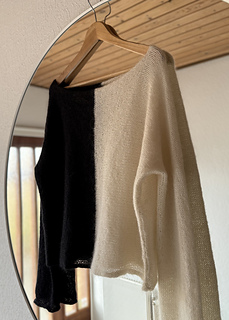 The blouse is worked in 2 strands: 1 strand of Alpaca 1 (400 m / 50 g, 100 % alpaca) + 1 strand of Silk Mohair (212 m / 25 g, 75 % super kid mohair and 25 % silk) - both from Isager Yarn