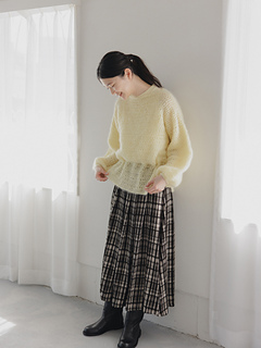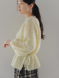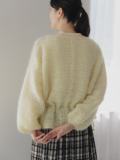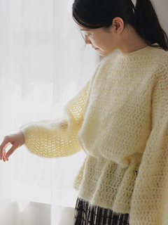 ふわふわしたモヘヤの編み地と女性らしいシルエットが印象的なウエア。身幅が広く肩が下がっているので、体型を気にせず着用いただけます。ふんわりとした袖とキュッとしぼったウエスト部分から広がる裾や背中に入ったラインなどこだわりが詰まっています。太い針を使って長編み中心に真っすぐザクザク編めるのでウエアを編むのが初めての方にも挑戦しやすいデザインです。