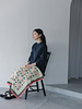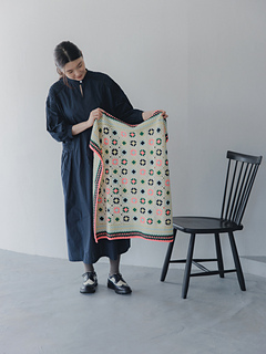 膝掛けはもちろん肩掛けもできるマルチケットは、きなりベースの編み地にカラフルな幾何学模様が映えます。ナチュラルな光沢感とスパニッシュメリノの特徴を生かしたふくらみがあるスーパーウォッシュスパニッシュメリノ6色を使用しています。