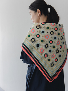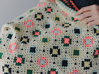 同じ編み図を使って配色を替えながら5タイプのモチーフを編み、展開図にそって編みつないでいきます。つなげるごとにカラフルに大きく広がる編み地を楽しみながら編んでいただけます。
