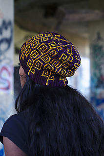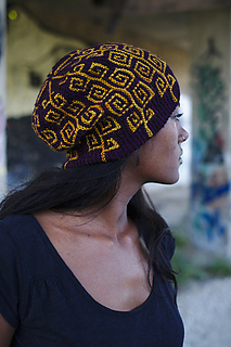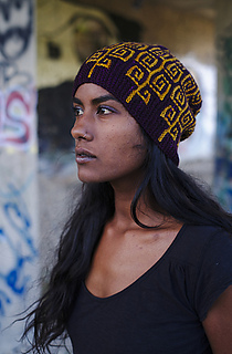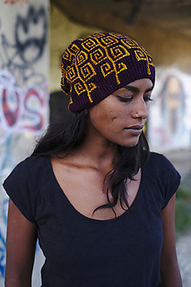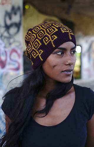 Which way is up? Although this pattern seems to grow from the brim to the crown, in fact it is knit sideways with just one colour per row, like all the other Hats in the Convergence collection. Clever short-row engineering ensures that these large chunks of solid colour don’t disrupt the mosaic technique.