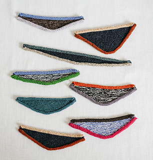 減らし目の間隔と引き返し編みの間隔を変更することで, 形のバリエーションを作ります. ガーター編みの三角形は引き返し編みのルールを覚えてしまったらパターンを見なくても編めるのでモバイル編みにぴったりです.
