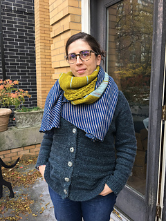 It’s a generous rectangular shawl knit from four different colors, using short rows to seamlessly combine textures like stripes and lace into a garment that captures the steep lines and beautiful color play of the Verdon Gorge itself.