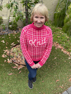 The sweater is worked top down seamlessly. It has a folded neckline and twisted ribbing on the cuffs and hem. The sweater has an all-over plaid colorwork pattern with a big ‘Knit’ text on the front. The sleeves are raglan sleeves, and the hem is cropped. And there’s a little surprise at the back!
