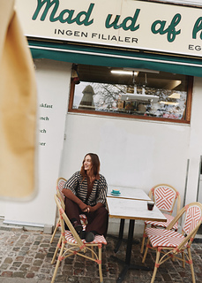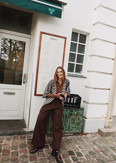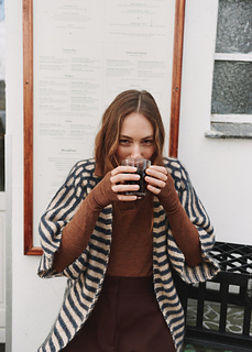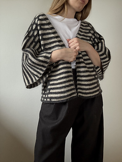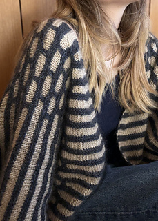 Virginia Jacket is my re-imagination of Marianne Isager’s classic design Ringe and a part of the Isager Archives Collection 2025. The original design is characterized as a shorter and more fitted jacket and longer sleeves with the beautiful honeycomb pattern. I kept the original construction and pattern but gave Virginia a more over-sized and cape-like style. Virginia is worked with tweed, which naturally has a lot of depth to the colors, emphasizing the beautiful contrast between the stripes. Virginia Jacket is my interpretation of a meeting between Marianne’s fantastic design expression and my own design interpretation.