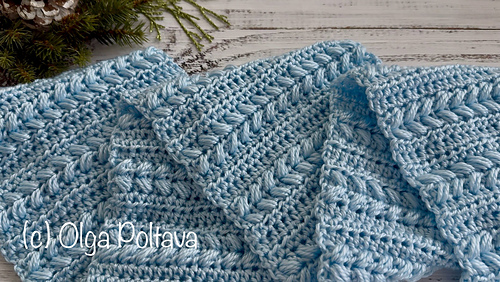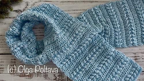 This is a pattern for a crochet scarf, made with worsted weight yarn, category 4, 100% acrylic and size H (5 MM) hook. I used two skeins of Soft & Shiny by Loops & Threads, color Icy Blue, 1 skein = 311 yards, 170 grams. Total amount of yarn need is about 620 yards or 340 grams.