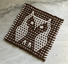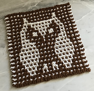 Use up small amounts of yarn to make a useful potholder or cleaning cloth with a helpful owl. Worked in mosaic garter stitch, just one strand works every two rows while the other strand rests at the edge. Gauge and dimensions are provided with a medium weight cotton. Choose colors that contrast well. Try your camera’s “black & white” setting to look at your yarns in gray-scale and check the contrast between your selection(s). The pattern provides full written instructions with (optional) positive and negative charts for making useful household linens and gifts!