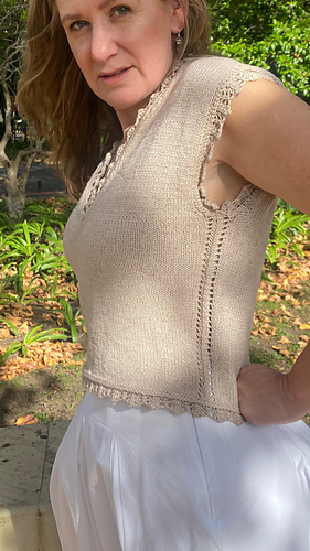 -- Delicate lace edgings, knit separately and attached using a 3-needle bind-off. This creates a neat ridge around the neckline, armholes, and hem, giving the illusion of lace peeking through from underneath.