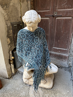 The shawl is a triangle constructed as a large circular swatch, with the two “sides” connected only by a fringe, a strand of yarn carried between edges, later cut and trimmed.