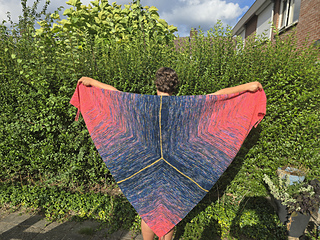 YPSILON is a huge triangle shawl which uses five colours in a fading order. It has build-in iCord edges and optional iCord-tails at all three ends.