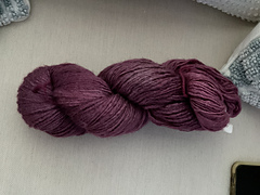 A thick and thin slub yarn. Brooks Farm’s Website recommends using a size 6 needle for textured garter or a size 10 for a lacy effect. Gauge information/recommendation is not given.