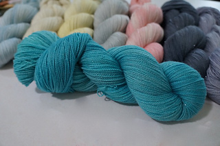 Etude Lace is an 80/20 blend of merino wool and silk. It’s soft and has a subtle sheen to it from the silk content.